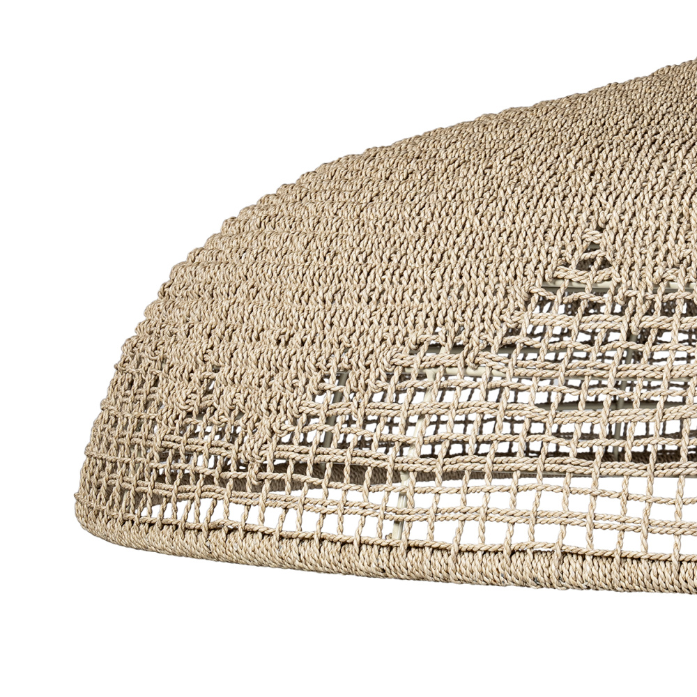 Hand-twisted synthetic weave in an oatmeal color, woven and wrapped around a powder coated aluminum frame. Chandelier comes with an antique brass finished metal chain and canopy hanging kit. Suitable for covered outdoor use in a damp location with no dire