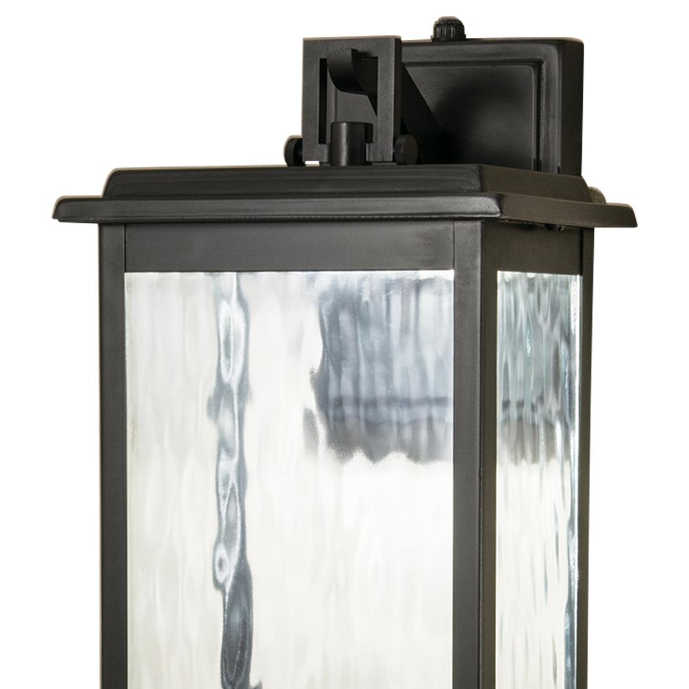 The Weymouth Outdoor sconce has a built in photo sensor that comes on at dusk and turns off at dawn. With angular lines and substantial wavy glass surfaces spreads ample LED illumination