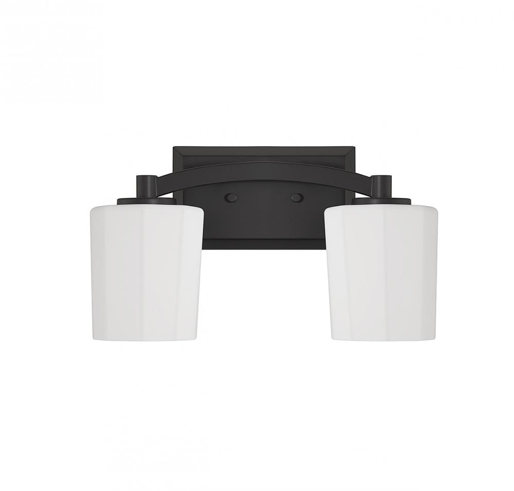 Get understated glamour for the bathroom with this Savoy House Whitney 2-light bath vanity light. Fluted shades of opal etched glass offer up a flattering glow, the curving arm adds intrigue and the matte black finish adds versatility. Whitney is 8" in height, 14" in width and extends 6.5" from the wall. It uses two standard size bulbs of up to 60 watts per bulb (bulbs not included).