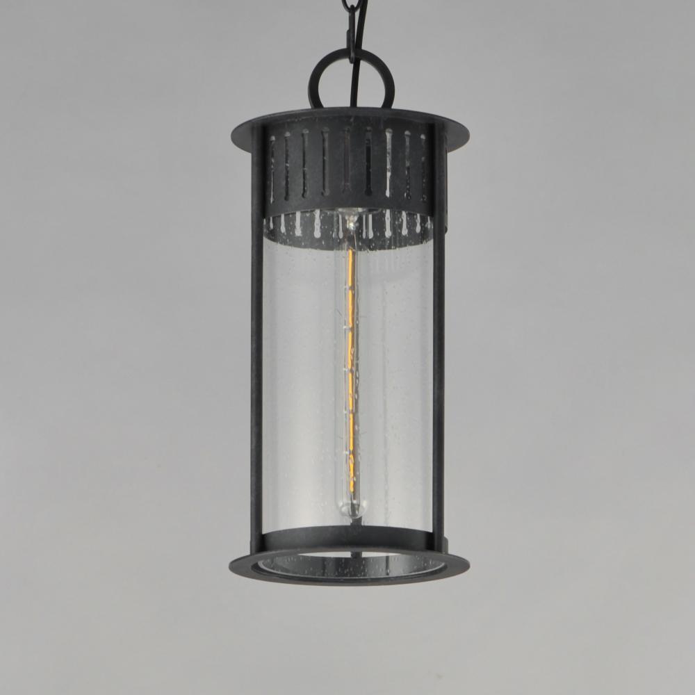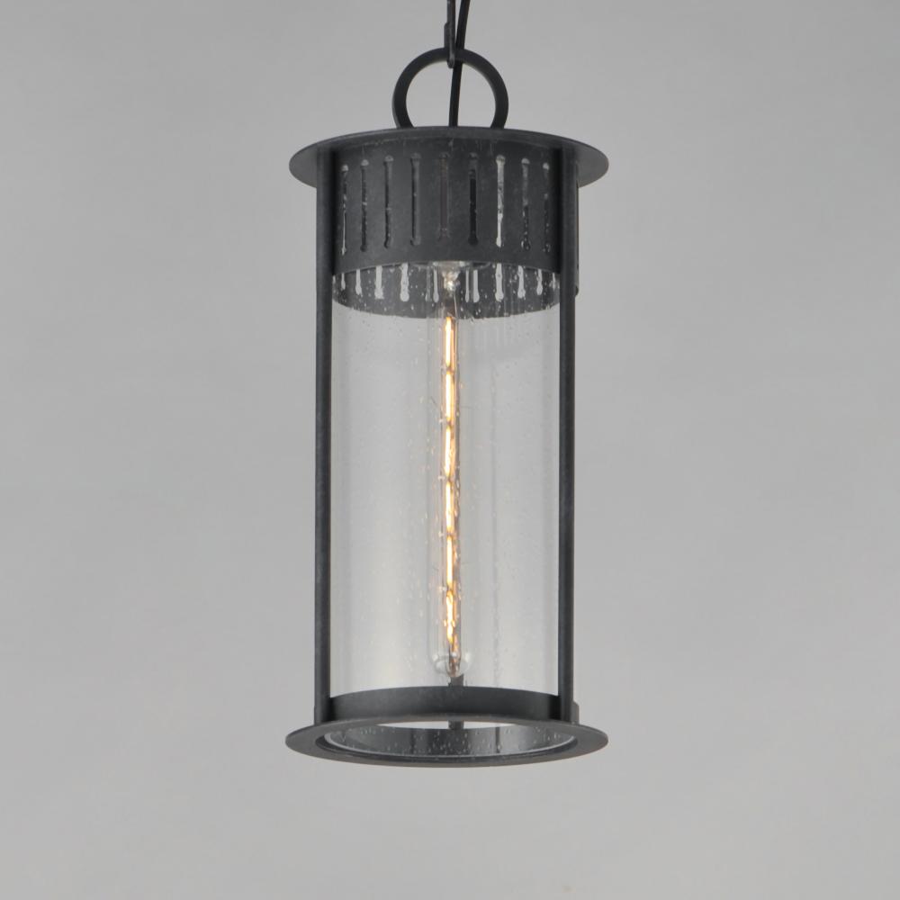 Inspired by the rounded towers of Windsor Castle, this outdoor lighting collection features a hand-applied Black Patina finish on Stainless Steel. A slotted filigree along the top of the cylinder frame allows light to escape, while the clear seeded glass o