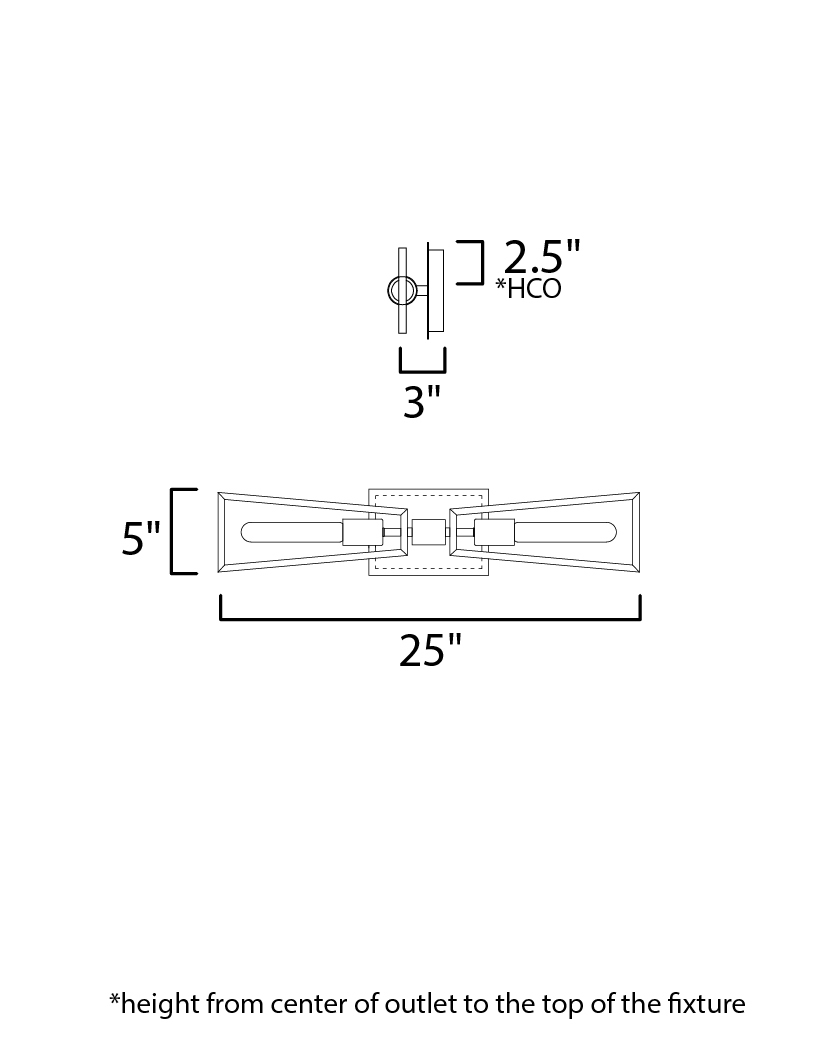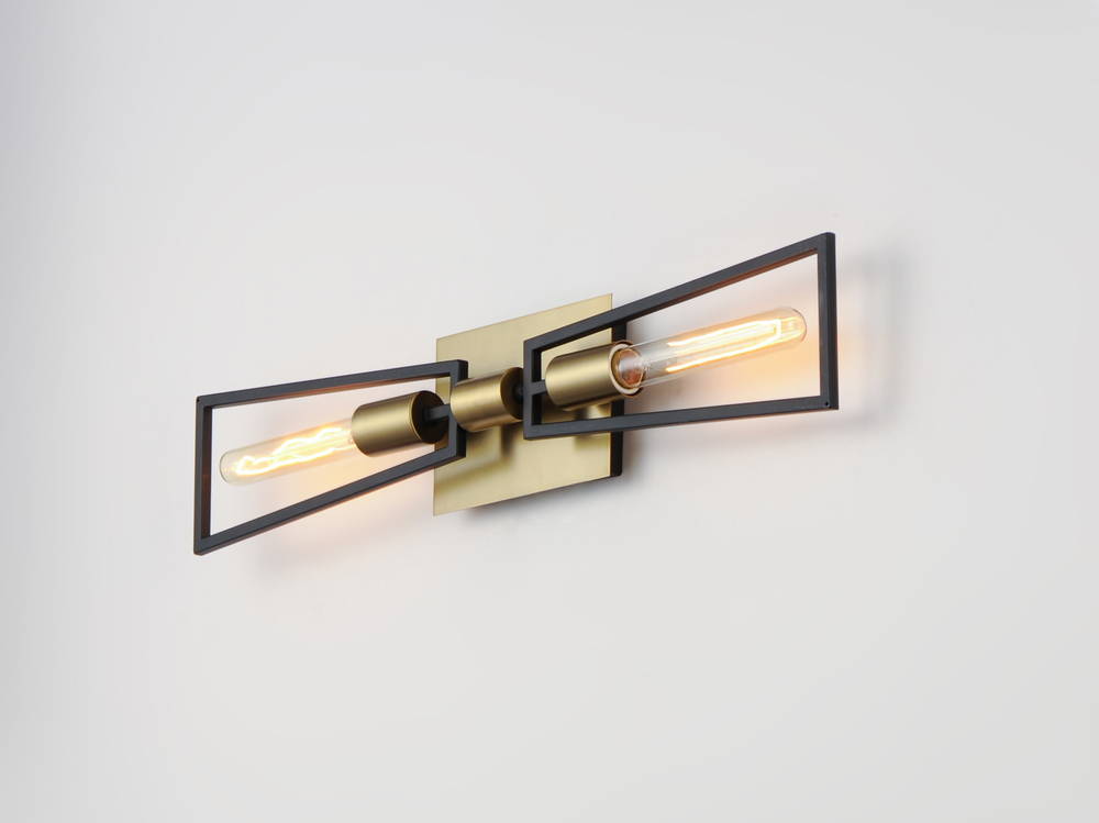 Sharp lines radiate from a pointed pin central body creating geometric angled wings that are sandwiched between matching conical fonts. Finished in a combination Antique Brass and Black, this collection is both contemporary and warm. Complete this look wit