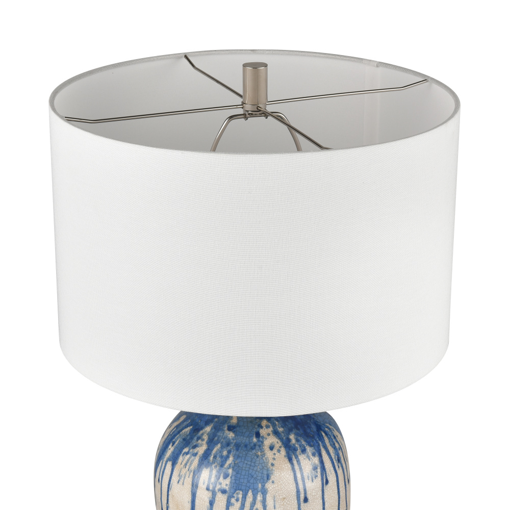 Ideal for a coastal style living room or hallway, the Winship Table Lamp is made from earthenware in a classic vase shape. Its eye-catching crackled glaze finish adds subtle tones of rustic, antique style with a fresh palette of white and dripping blue streaks. Its charming silhouette is topped with a round, hardback shade in white faux silk for a subtle touch of luxe.