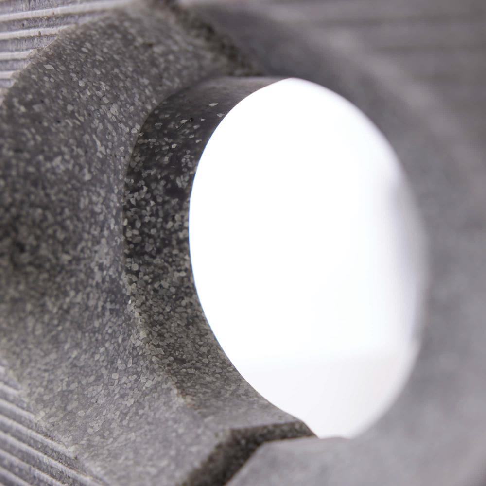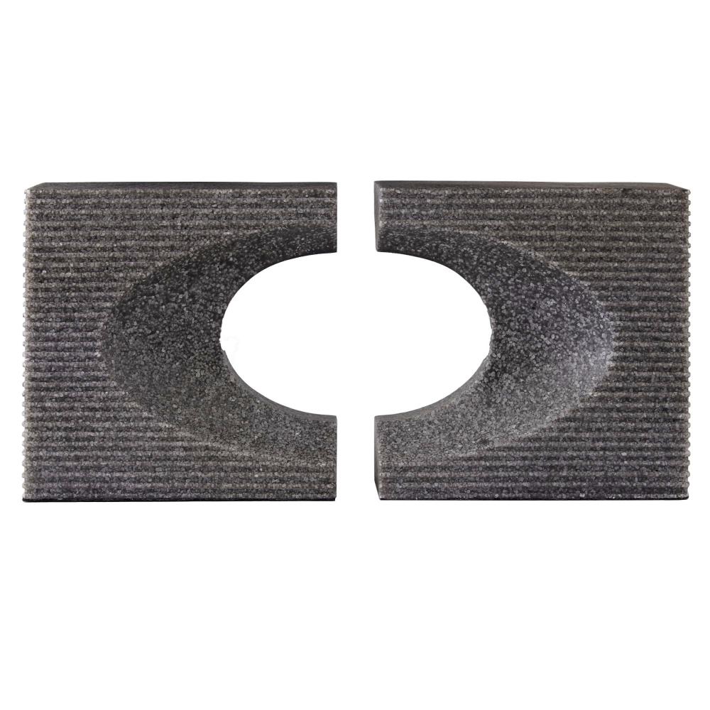 BRUTALIST INSPIRED, OUR WOLCOTT BOOKENDS, IN GRAPHITE RICESTONE COMPOSITE, FEATURE GRAPHIC CUTOUTS AND A CHISELED TEXTURE INSPIRED BY CONCRETE ARCHITECTURE OF THE PERIOD. THIS RICHLY SIMPLE PAIR CAN BE USED AS BOOKENDS OR STYLED TOGETHER AS SCULPTURE. FINISH WILL VARY.
