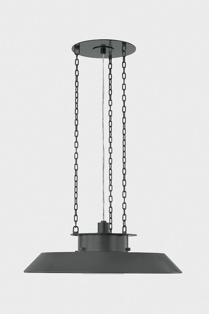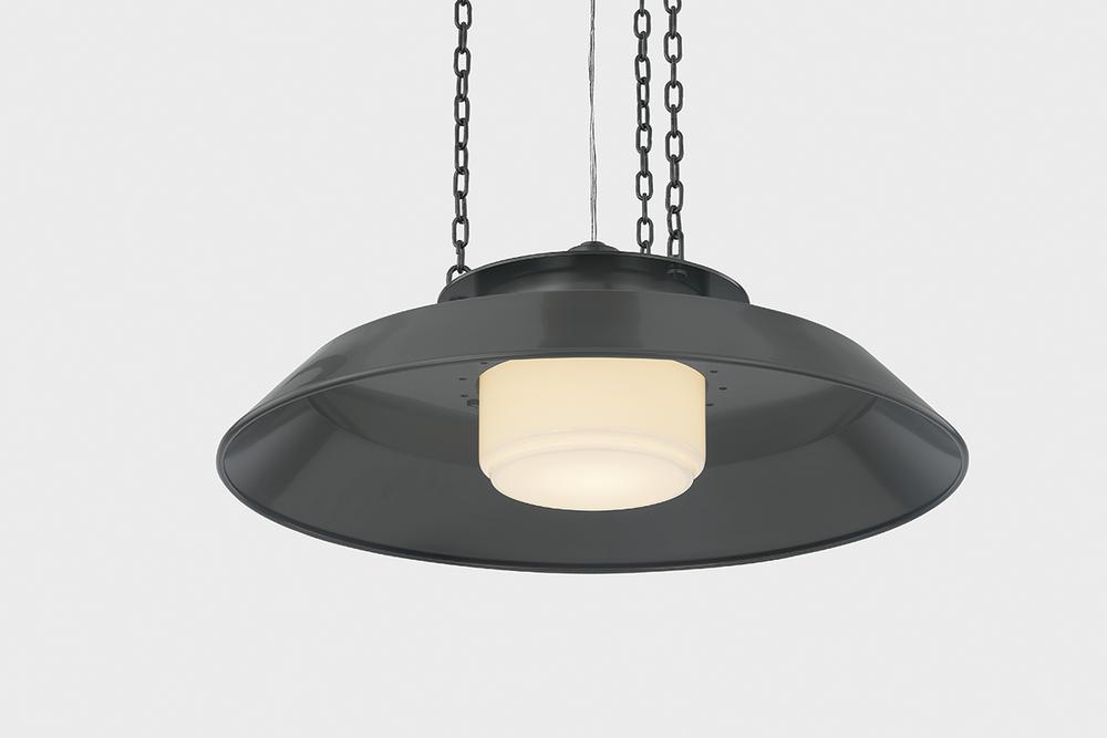 Taking cues from the innovative lamping techniques of bespoke maker brands, Woodrow features a classic RLM-style pendant silhouette. Beneath the large reflector, the opal shiny shade filters light both downwards and outwards. Three clean chains suspend this fixture, which is available in two sizes.