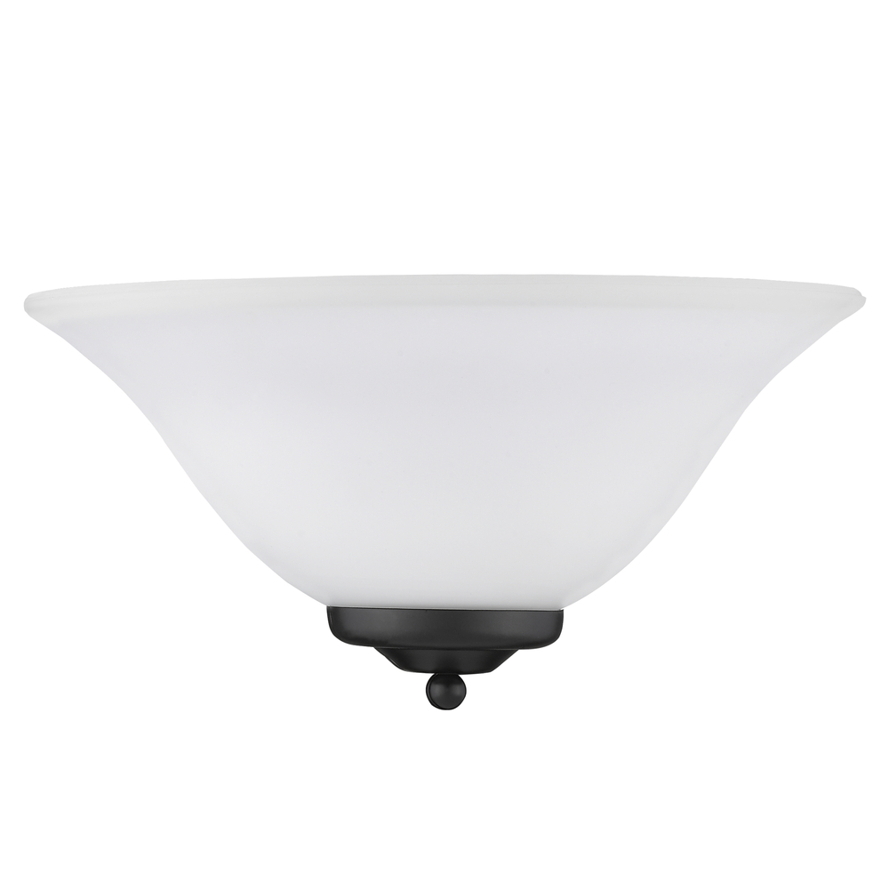 Bring modern elegance into your home with the Wry Lighting Bella 1-light Wall Sconce in Matte Black. Featuring an opal glass shade and a sleek matte black frame, it creates a sophisticated ambiance. The opal glass shade is designed to diffuse light evenly, offering a soft, glare-free glow that adds a touch of refinement. This timeless design is perfect for elevating any decor. The matte black finish exemplifies clean, modern style with its smooth, non-reflective surface, making it a versatile choice that complements both industrial and contemporary settings. Damp location rated, this fixture is suitable for covered spaces like bathrooms and laundry rooms. Enhance hallways, stairways, or create a cozy atmosphere in bedrooms and dining rooms. Overall Dimensions: 13.13"W x 6.38"H x 6.63"D. Requires 1 E26 Medium base bulb (not included, max 100 wattage). This stylish wall sconce unites function and form, bringing a contemporary touch to any space.