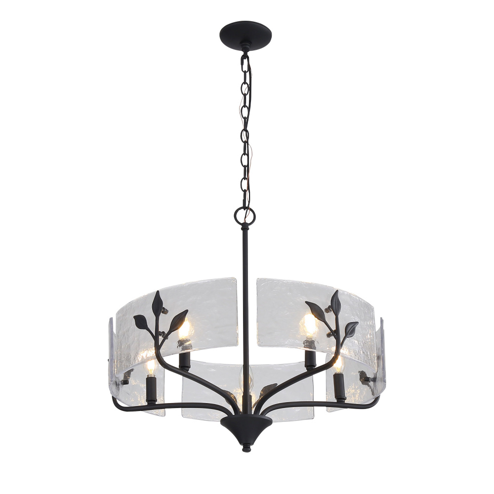 Bring nature-inspired elegance into your home with the Wry Lighting Bloem 5-light Pendant in Natural Black. Featuring a glass shade and a natural black frame, it creates a welcoming atmosphere. This glass shade showcases a hammered water design, featuring an organic texture that distorts and refracts light beautifully. The natural black finish offers a softer, more organic take on classic black, resembling a dark charcoal with a matte surface, perfect for a range of styles. Ideal for indoor spaces not subject to moisture, such as bedrooms or hallways, this pendant is sloped-ceiling compatible and its adjustable height ranges from 25.5" to 99". Overall dimensions are 24"W x 22"H x 24"D, and it requires 5 E12 candelabra base bulbs (not included) with a maximum of 60 watts per bulb. Add a stylish statement to your home with this handcrafted fixture, celebrating quality and artistry.