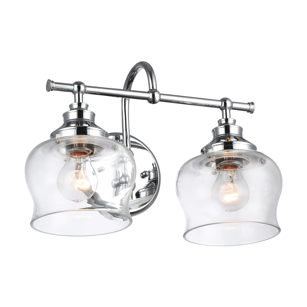 Bring Transitional elegance into your home with the Wry Lighting Daphne 2-light Vanity in Chrome. Featuring a glass shade and a polished chrome frame, it creates a welcoming atmosphere. The clear glass shade offers brilliant, unobstructed light, making it a versatile choice for various styles including modern to traditional. The polished chrome finish adds a sleek, timeless appeal, elevating your space with its mirror-like surface. Damp location rated, this fixture is suitable for covered and semi-enclosed spaces with occasional moisture, such as bathrooms and laundry rooms. Requires two E26 medium base bulbs (not included) with a maximum wattage of 60 per bulb. Overall dimensions are 15.13"W x 10.13"H x 8.5"D. Experience a blend of style and quality with this elegant piece from Wry Lighting.