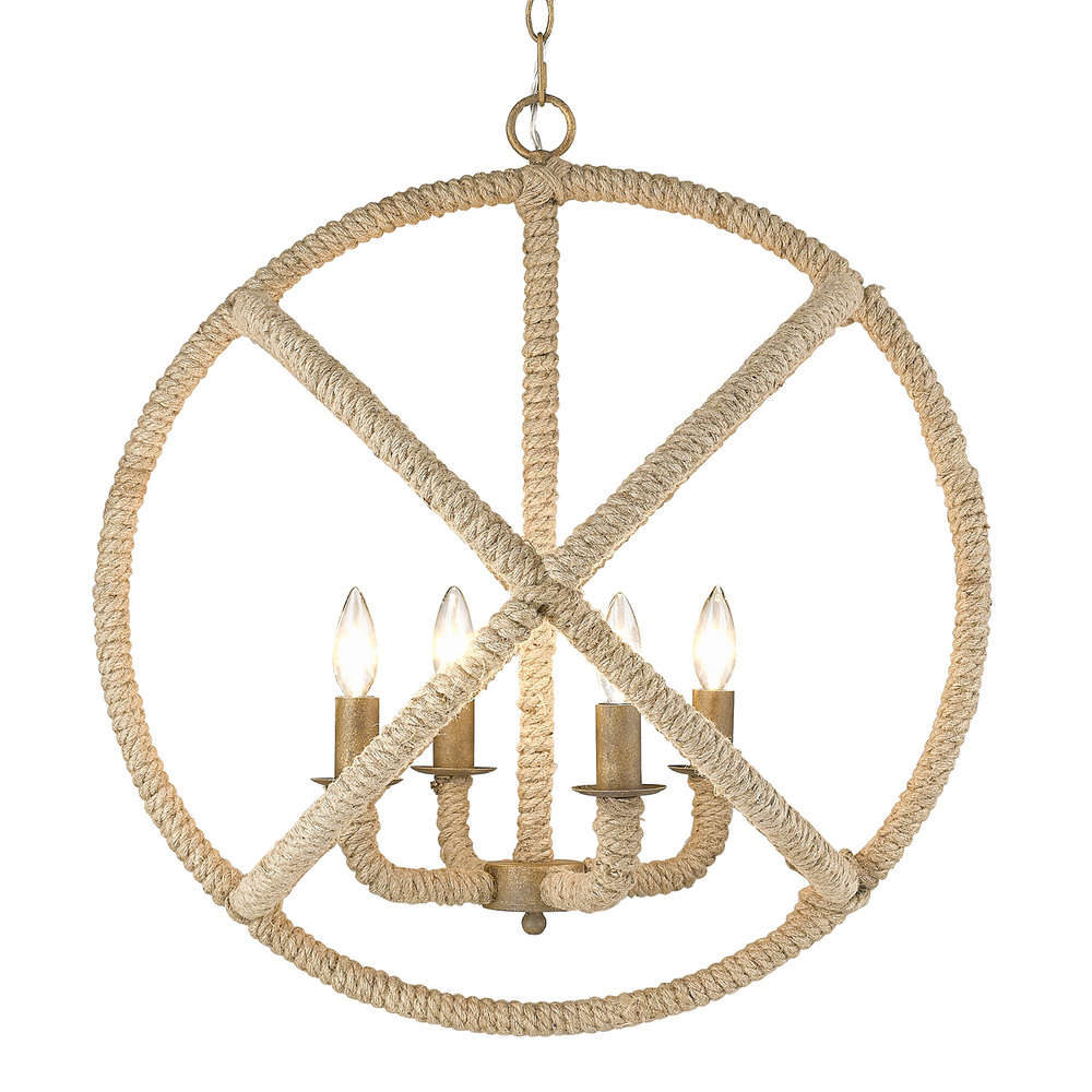 Bring coastal elegance into your home with the Wry Lighting Marina 4-light Chandelier in Burnished Chestnut. Featuring a frame with a beautiful Burnished Chestnut finish, it creates a welcoming atmosphere. This chandelier boasts no shade, allowing the light to flow freely and brighten your space. The authentic rope accents add an organic touch, enhancing the textural experience. The rich and earthy Burnished Chestnut finish has a warm, substantial feel and is beautifully enhanced with luminous antique gold highlights. Its subtle cast-metal texture and satin sheen create a cozy glow. Perfect for dining rooms and living spaces, this chandelier is dry location rated, making it ideal for indoor spaces not subject to moisture. It's compatible with sloped ceilings and features an adjustable height from 28.125" to 99.125", allowing for a customized fit. Overall Dimensions: 23" W x 25.5" H x 23" D. Requires 4 E12 candelabra base bulbs (not included), max 60 wattage per bulb. Elevate your interior with this stunning chandelier, loved by customers for its beautiful design and easy installation.