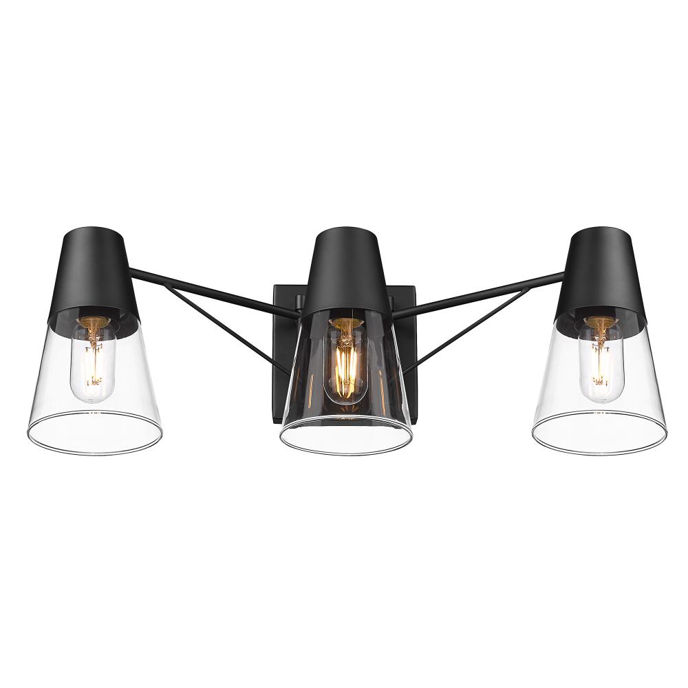 Bring modern industrial elegance into your home with the Wry Lighting Ryker 3-light Vanity in Matte Black. Featuring a glass shade and a matte black frame, it creates a welcoming atmosphere. The clear glass shade offers brilliant, unobstructed light, complemented by its polished high-gloss finish. This versatile shade shines brightly, making it perfect for various styles, from minimalist to contemporary. With the epitome of clean, modern style, the matte black finish has a smooth surface that absorbs light to deliver a sophisticated look. It's suitable for covered spaces like bathrooms and protected outdoor areas, ensuring safety and style. Overall Dimensions: 25.38"W x 8.5"H x 8.63"D, Requires 3 E26 Medium base bulbs (not included) with a maximum wattage of 60 per bulb, providing both functionality and elegance to your lighting scheme. Enhance your bathroom’s ambiance with this sleek and elevated fixture from Wry Lighting, where quality meets contemporary design.