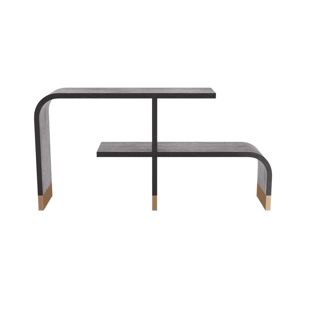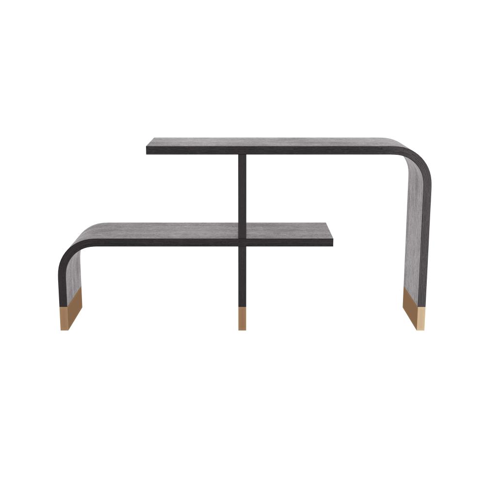 INSPIRED BY ART DECO SHAPES, THE SINUOUS WYNGATE ETAGERE MAKES A GRACEFUL AND DRAMATIC DISPLAY PIECE. TWO EBONY OAK VENEER SHELVES WITH WATERFALL CURVES CREATE STAGGERED HEIGHTS. THICK BANDS OF ANTIQUE BRASS WRAP EACH LEG, PROVIDING CONTRASTING DETAIL. FINISH WILL VARY.