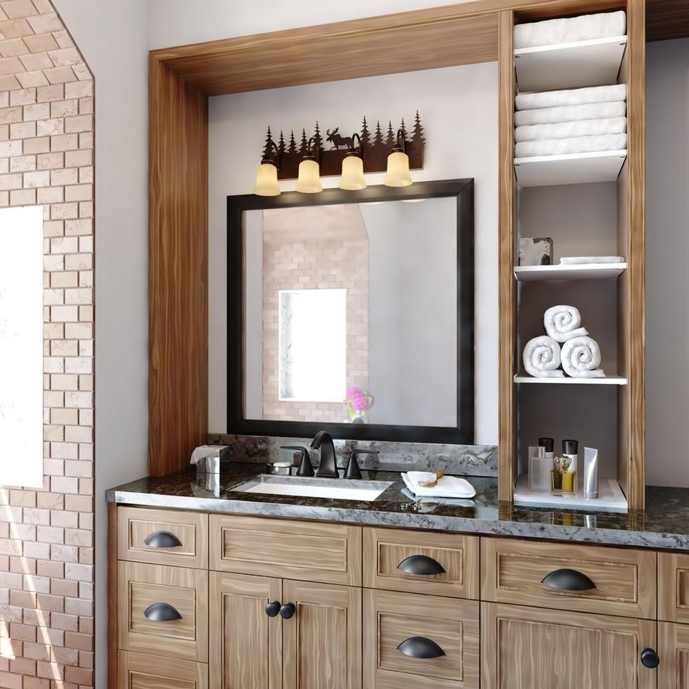 Evoking the spirit of the wilderness, this rustic themed light is clad in a burnished bronze finish and features silhouetted moose imagery atop glowing amber flake glass. It is a great choice for a vacation lodge, cabin or suburban home and will complement a variety of home styles: anywhere you want to bring an element of nature. This bathroom light is perfect over large or double vanities where there is only one outlet box. The full back plate creates the perfect solution to any space where a larger back plate is needed.