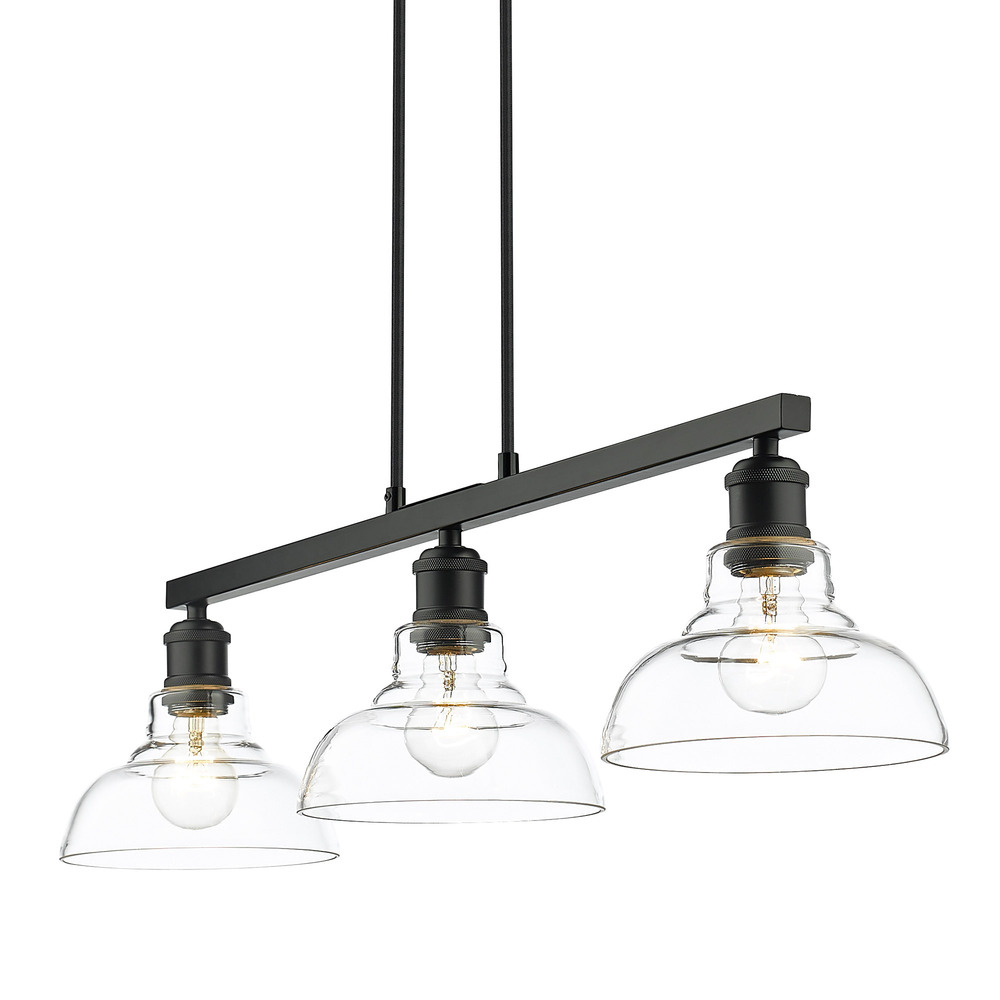 Bring modern elegance into your home with the Yep by Golden Lighting Carver 3-light Island Light. Featuring a glass shade and a Matte Black frame, it creates a welcoming atmosphere. The Clear Glass shade offers brilliant, unobstructed light. This polished glass allows the beauty of the bulb and the fixture's design to take center stage, making it a perfect choice for spaces where clear illumination is essential. The epitome of clean, modern style, our Matte Black finish is timeless and versatile, complementing a wide array of decors. It's smooth to the touch, delivering an understated elegance that enhances any room. Tailored for kitchen islands, these multi-light fixtures deliver both utility and modern flair. This fixture is Damp Location Rated, suitable for covered and semi-enclosed spaces with occasional moisture. It is also Sloped-Ceiling Compatible and Adjustable Height, making it easy to customize to your space. Overall Dimensions: 35.5"W x 9.5"H x 8.25"D. Requires 3 E26 Medium base bulbs (not included), with a maximum wattage of 60 per bulb. Close with lifestyle appeal and quality—for a fixture that harmonizes form and function.