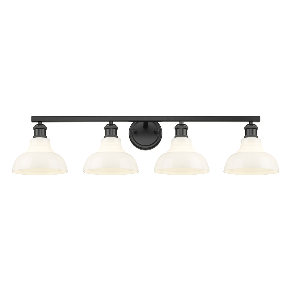 Bring modern elegance into your home with the Yep by Golden Lighting Carver 4-light Vanity. Featuring a vintage milk glass shade and a matte black frame, it creates a welcoming atmosphere. The vintage milk glass shade features a dense, opaque milky white color, polished to a beautiful, glossy sheen. This classic glass provides a soft, luminous glow, reminiscent of schoolhouse antiques, perfect for a charming touch to your space. The matte black finish is timeless, versatile, and smooth to the touch, offering an understated elegance that complements various decor styles. Ideal for bathrooms, this fixture is damp location rated, making it suitable for covered areas with occasional moisture. Requires no specific installation and is flexible enough for most spaces. Overall Dimensions: 36"W x 8.63"H x 8.63"D. Requires 4 E26 Medium base bulbs (not included), up to 60 watts each. Enhance your lifestyle with this quality fixture that merges style with functionality.