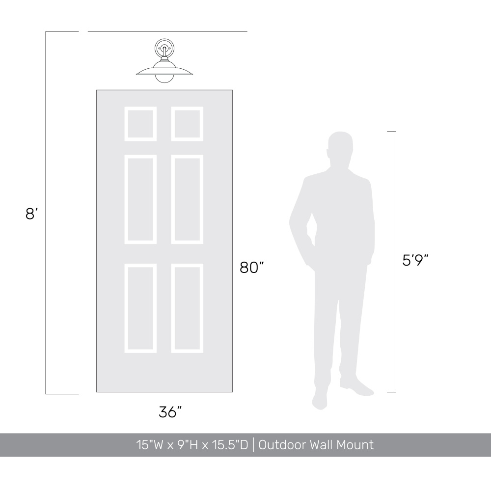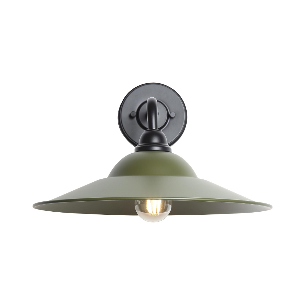 Bring farmhouse elegance into your home with the Yep by Golden Lighting Croma 1-light Wall Sconce. Featuring a metal shade and a matte black frame, it creates a welcoming atmosphere. The metal shade showcases a Matte Pine finish, featuring a solid, muted olive green color. This provides an organic touch while absorbing light with its velvety, non-reflective matte surface. The matte black finish is timeless and versatile, smoothly designed to complement various decor styles. Wet Location Rated: Designed to withstand exposure to elements, making it perfect for uncovered outdoor areas. Enhance hallways, stairways, and bathrooms — or add cozy ambiance in bedrooms, dining rooms, and entry points. Requires 1 E26 Medium base bulb (not included), Max 60 watts. Overall dimensions are 15"W x 9"H x 15.5"D. Close with lifestyle appeal and quality, making this the perfect choice for those seeking classic charm in their outdoor lighting.
