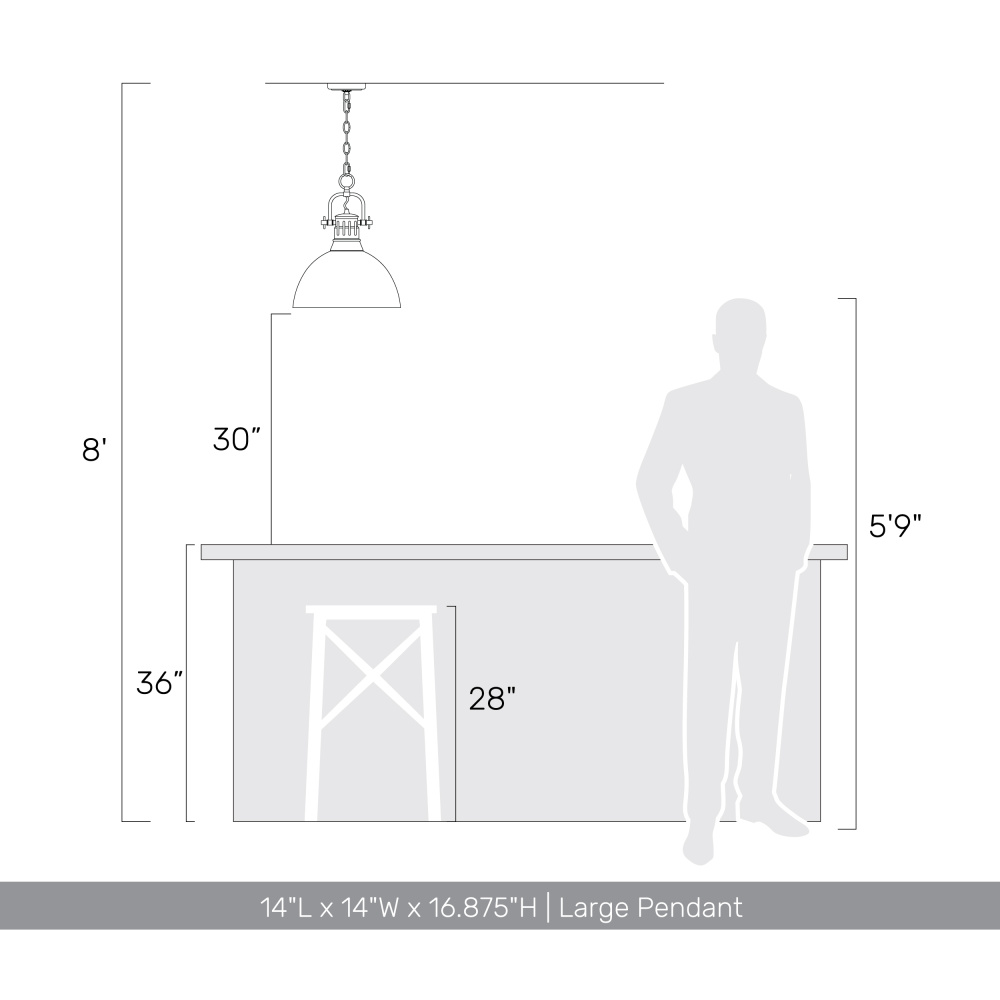 Bring Farmhouse elegance into your home with the Yep by Golden Lighting Duncan 1-light 14in Chain Hung Pendant. Featuring a metal shade and a polished chrome frame, it creates a welcoming atmosphere. The metal shade in Seafoam finish brings breezy, coastal charm to your space with its light, pastel blue-green color and highly reflective, high-gloss sheen. The brilliant polished chrome finish offers a crisp, clean look that elevates any space, seamlessly integrating into various decor styles. This pendant is damp location rated, making it suitable for covered and semi-enclosed spaces like bathrooms and covered porches. It’s sloped-ceiling compatible and features adjustable height, ranging from 19.875" to 91.875". Overall Dimensions are 14"W x 16.88"H x 14"D and it requires 1 E26 Medium base bulb (not included) with a maximum wattage of 100. Close with style and quality that elevate any room.