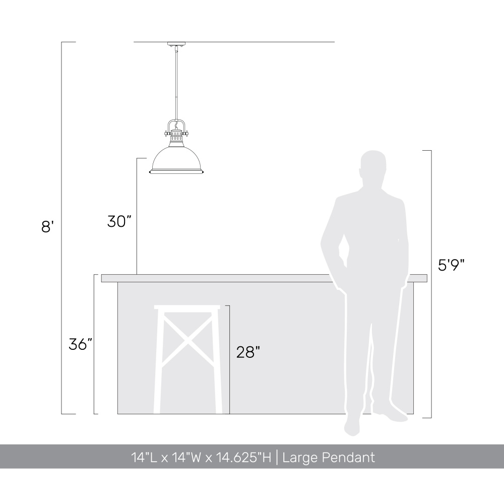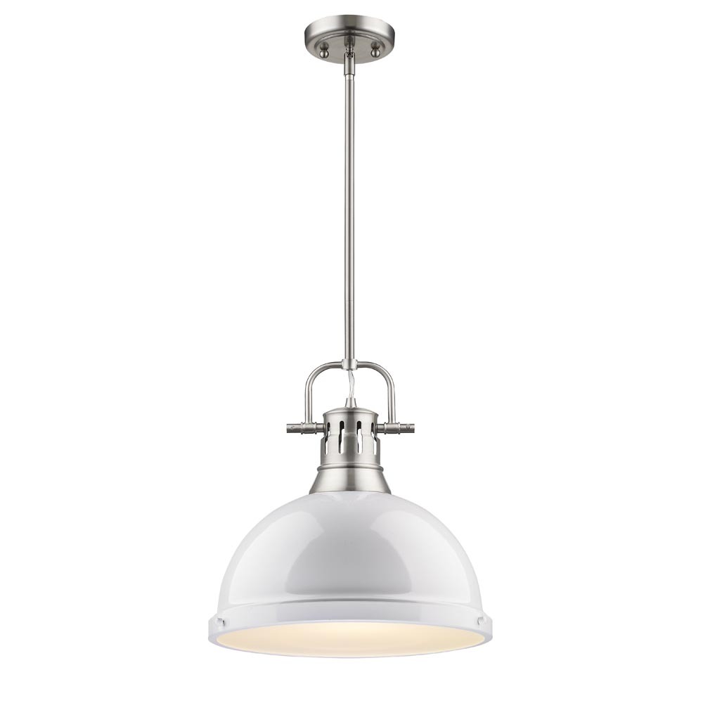 Bring farmhouse elegance into your home with the Yep by Golden Lighting Duncan 1-light 14in Rod Hung Pendant. Featuring a metal shade and a pewter frame, it creates a welcoming atmosphere. The metal shade in White adds a crisp, clean element, reflecting light beautifully with its high-gloss finish while maintaining a timeless utility style. This fixture is perfect for kitchens, dining rooms, or bedrooms and is Damp Location Rated for covered and semi-enclosed areas. The pendant is also sloped-ceiling compatible and features adjustable height (Min: 22.875"- Max: 58.875"), ensuring easy installation tailored to your needs. Overall Dimensions are 14"W x 14.63"H x 14"D, and it requires 1 E26 Medium base bulb (not included), with a maximum wattage of 100. Elevate your lighting experience with this stylish pendant that combines functionality with enduring style.