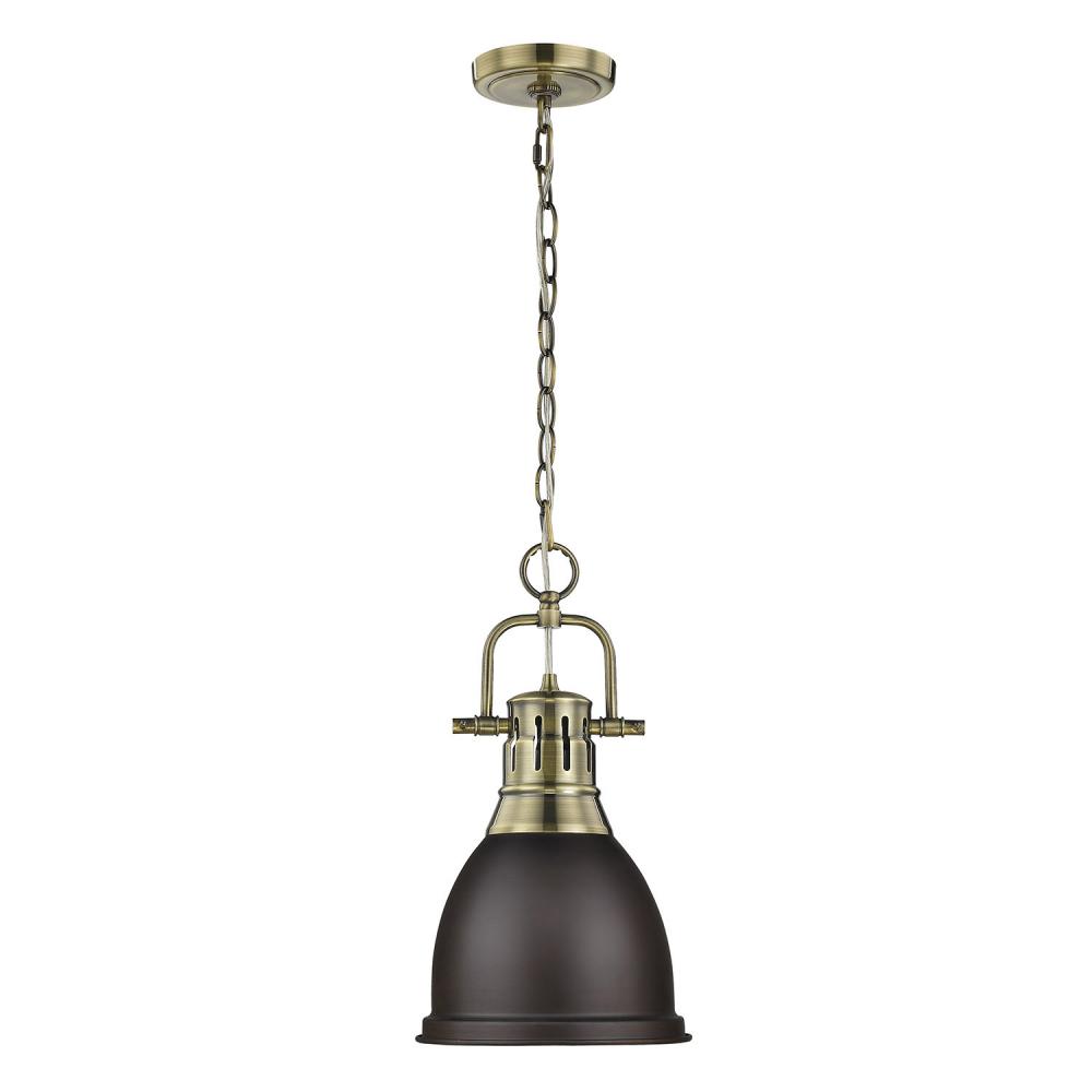 Bring farmhouse elegance into your home with the Yep by Golden Lighting Duncan 1-light 9in Chain Hung Pendant. Featuring a metal shade and an aged brass frame, it creates a welcoming atmosphere. The rubbed bronze finish showcases a rich, dark brown color with subtle highlights that beautifully diffuses light. The timeless Aged Brass finish offers a warm, inviting glow, reminiscent of vintage heirlooms. This classic fixture is perfect for adding a statement in kitchens, dining rooms, or even bathrooms, making it suitable for covered and semi-enclosed spaces with occasional moisture. Installation is a breeze with its sloped-ceiling compatibility and adjustable height, ranging from 19.5" to 91.5". Overall dimensions are 8.88"W x 16.5"H x 8.88"D, and it requires 1 E26 Medium base bulb (not included) with a maximum wattage of 100. Enhance your space with a piece that blends rustic charm and quality craftsmanship.