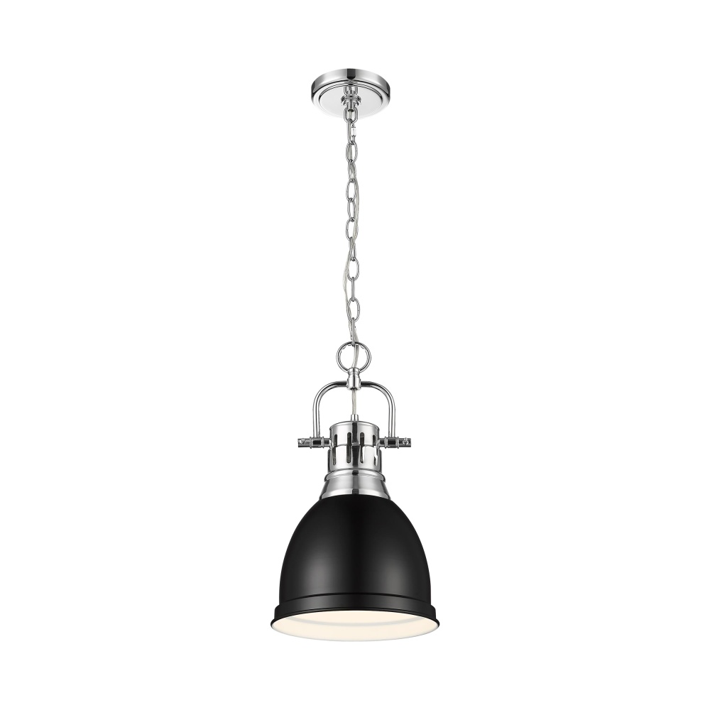 Bring Farmhouse elegance into your home with the Yep by Golden Lighting Duncan 1-light 9in Chain Hung Pendant. Featuring a metal shade and a chrome frame, it creates a welcoming atmosphere. The classic matte black metal shade evokes a clean modern style, providing a sophisticated look with a strong graphic quality. The brilliant Polished Chrome finish adds a timeless gleam, seamlessly integrating into a variety of decor styles. Ideal for spaces such as kitchens, dining rooms, and entryways, this pendant is damp location rated, ensuring it is suitable for covered and semi-enclosed places. Installation is easy, as it’s sloped-ceiling compatible and adjustable in height from 19.5" to 91.5". With overall dimensions of 8.88"W x 16.5"H x 8.88"D, this pendant requires 1 E26 medium base bulb (not included, max 100 watts). Perfect for achieving a rustic charm while enhancing your modern home, the Duncan pendant light inspires both functionality and style.