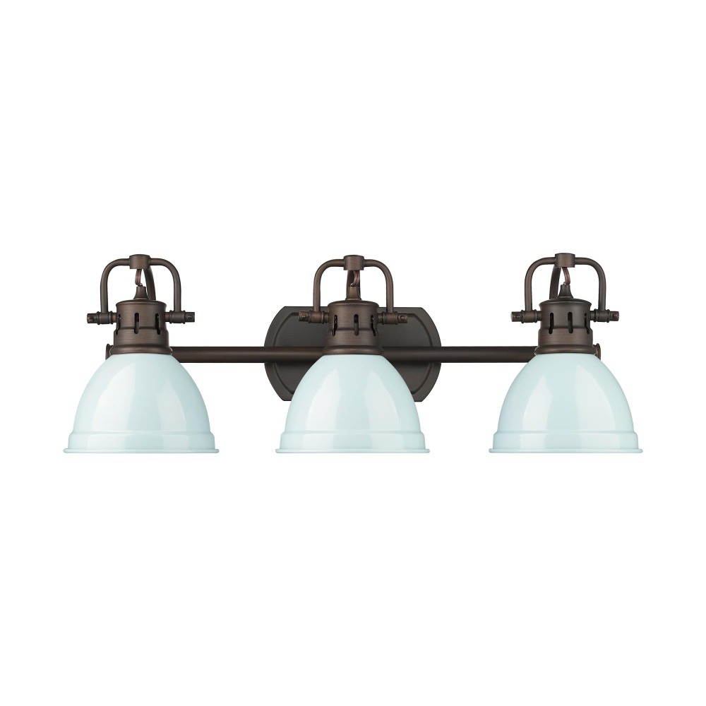 Bring farmhouse elegance into your home with the Yep by Golden Lighting Duncan 3-light Vanity. Featuring a metal shade and a rubbed bronze frame, it creates a welcoming atmosphere. The metal shade in seafoam adds a delightful light blue-green hue, perfectly complementing the vintage-inspired design. Its smooth reflective surface brings a cheerful pop of color to your space, evoking a breezy, coastal charm. This fixture is damp location-rated, making it suitable for covered and semi-enclosed spaces like bathrooms and laundry rooms. The adjustable directional heads allow you to customize the lighting to highlight specific areas, providing practicality blended with aesthetic appeal. Dimensions: Overall 24.5"W x 8.5"H x 8.25"D. Requires 3 E26 Medium base bulbs (not included), with a maximum wattage of 100 per bulb. Add a touch of retro style and quality craftsmanship to your home with this stunning vanity light.