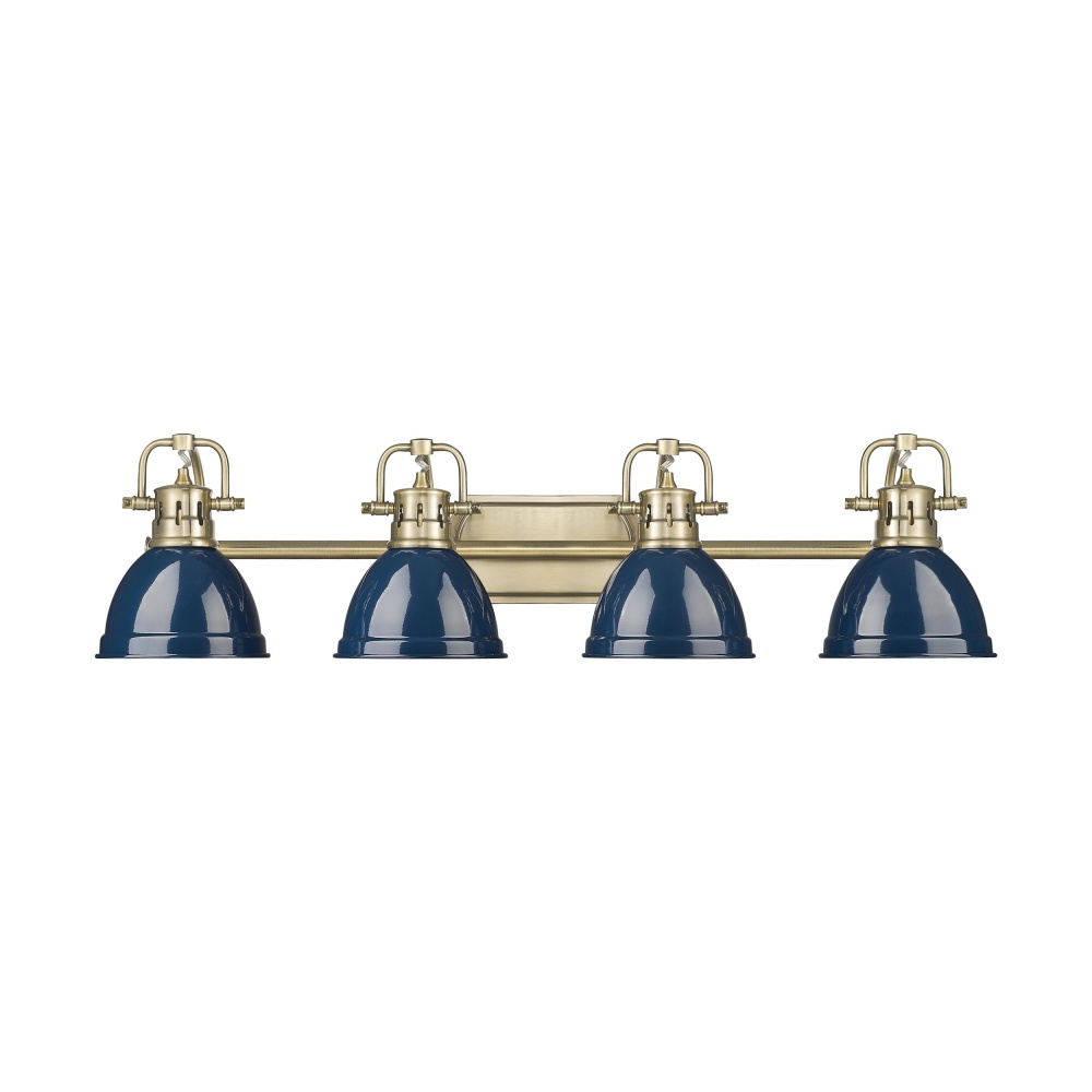 Bring timeless elegance into your home with the Yep by Golden Lighting Duncan 4-light Vanity. Featuring a metal shade and a classic aged brass frame, it creates a welcoming atmosphere. The navy blue metal shade offers a rich, deep color with a high-gloss sheen, reflecting light beautifully. Embrace the sophisticated aged brass finish, resembling vintage heirlooms, and adding depth to your decor. This versatile light is perfect for bathrooms, providing necessary illumination while being damp location rated for spaces with moisture. The adjustable directional heads allow customization, highlighting specific areas or objects for functionality. Dimensions: 33.5"W x 8.5"H x 8.25"D. Requires 4 E26 Medium base bulbs (not included), with a maximum wattage of 100 watts per bulb. Transform your space with this stylish, quality lighting solution.