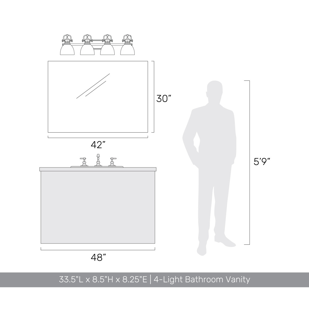 Bring contemporary elegance into your home with the Yep by Golden Lighting Duncan 4-light Vanity. Featuring a matte white metal shade and a polished Chrome frame, it creates a sophisticated atmosphere. The matte white shade absorbs light and diffuses it evenly for a clean, modern glow. The brilliant polished Chrome finish offers a sharp and timeless look that seamlessly integrates into various decor styles, from Scandinavian to industrial-chic. Ideal for brightening up bathrooms, this fixture is damp location rated, making it suitable for covered and semi-enclosed spaces with occasional moisture. Customize your lighting experience with adjustable directional heads, allowing you to highlight specific areas. Overall Dimensions: 33.5"W x 8.5"H x 8.25"D. Requires 4 E26 Medium base bulbs (not included), with a maximum wattage of 100 per bulb. Bring quality craftsmanship and modern style into your home with the Yep by Golden Lighting.