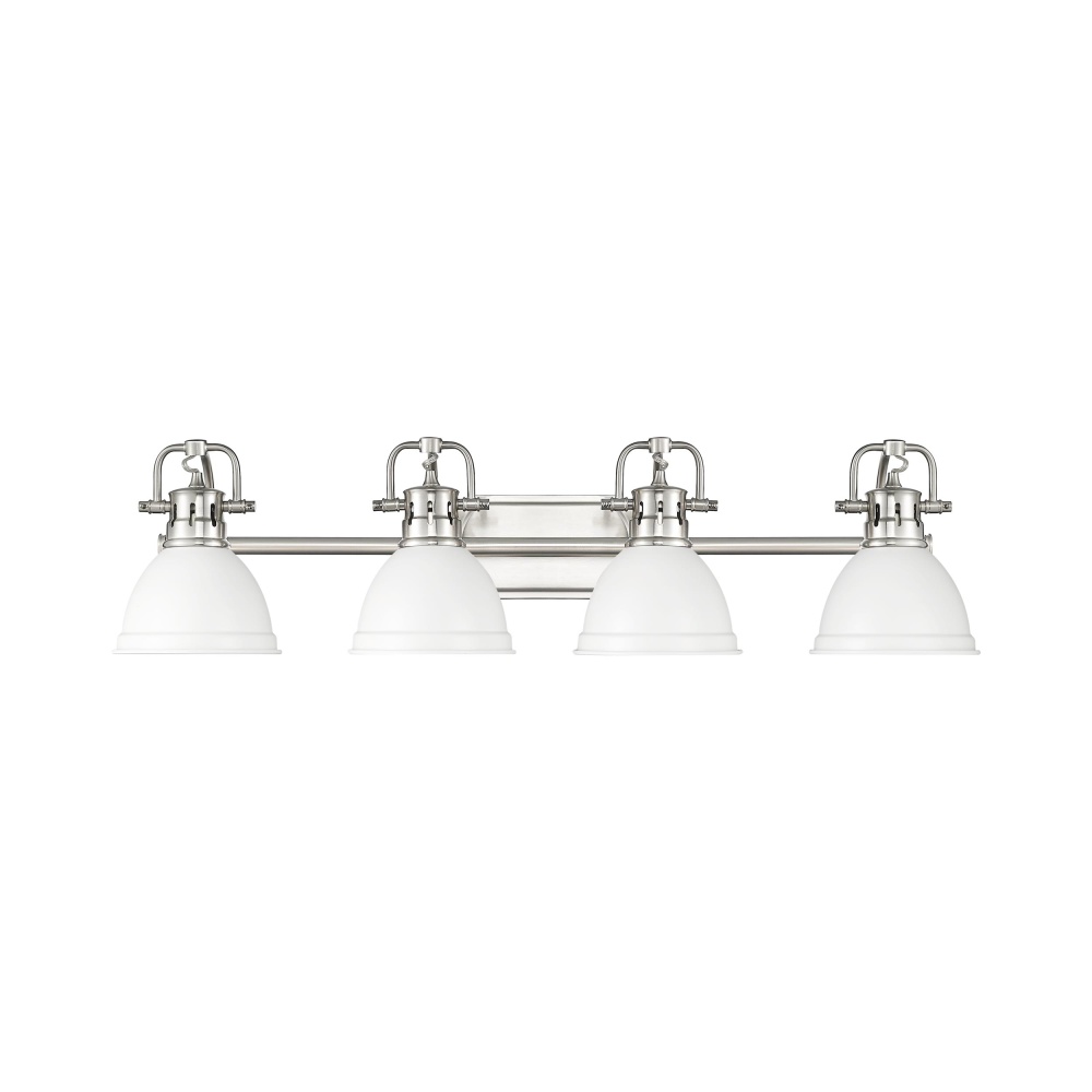 Bring farmhouse elegance into your home with the Yep by Golden Lighting Duncan 4-light Vanity. Featuring a metal shade and a pewter frame, it creates a welcoming atmosphere. The metal shade showcases a Matte White finish that features a pure, bright white color with a velvety, non-reflective matte surface, embodying modern minimalism. This surface beautifully absorbs light, creating a clean and sophisticated look that complements any decor style. Our pewter finish offers an understated and timeless appeal, ensuring durability through a careful electroplating process. This versatile fixture brings a touch of traditional charm to both classic and contemporary interiors. Brighten up bathrooms with dedicated lighting that flatters while providing practical task illumination. Damp Location Rated for areas with occasional moisture, this fixture's adjustable directional heads allow you to customize the light to highlight specific areas. Overall Dimensions: 33.5"W x 8.5"H x 8.25"D, requiring 4 E26 Medium base bulbs (not included, max 100 wattage per bulb). End your search for quality lighting solutions with Yep by Golden Lighting.