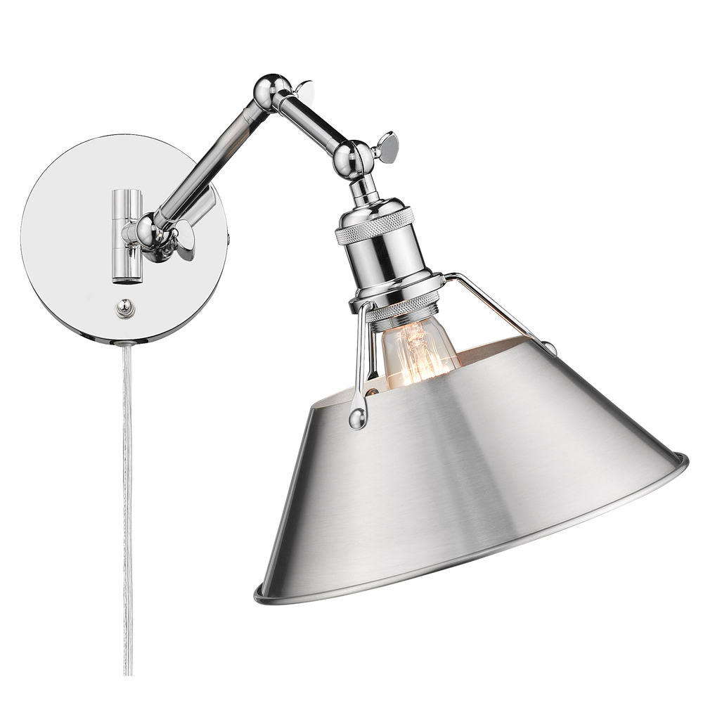 Bring industrial elegance into your home with the Yep by Golden Lighting Orwell 1-light Swing Arm Wall Lamp. Featuring a pewter shade and a chrome frame, it creates a welcoming atmosphere. The pewter shade provides a warm glow with its medium-grey hue and soft satin lustre, making it an elegant element in your space. The polished chrome finish enhances the lamp’s sleek look, integrating seamlessly into various styles. This adjustable lamp is perfect for bedrooms and home offices, and it is damp location rated for covered and semi-enclosed areas. The flexible task lighting with a convenient swing arm allows for precise positioning, while the adjustable head helps provide targeted illumination. Overall dimensions are 10"W x 9"H x 11.5"D, requiring 1 E26 Medium base bulb (not included) with a maximum of 100 watts. Elevate your decor with this stylish and high-quality fixture.