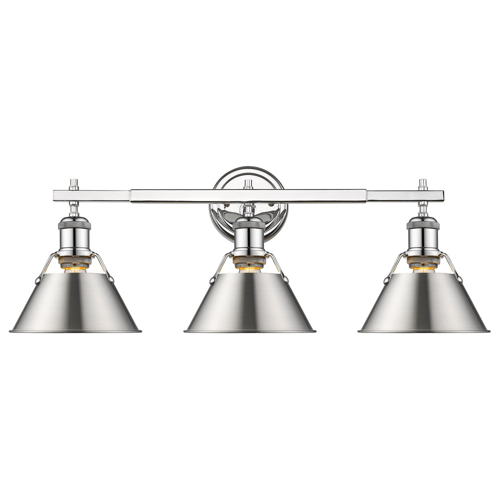 Bring industrial charm into your home with the Yep by Golden Lighting Orwell 3-light Vanity. Featuring a pewter shade and a polished Chrome frame, it creates a welcoming atmosphere. The metal shade in pewter offers a soft and classic alternative to brighter silver tones, diffusing light gently for an elegant, non-glare glow. The brilliant and timeless Polished Chrome finish offers a crisp, clean look that elevates any space, integrating seamlessly into various decor styles. This finish is created using a durable electroplating process that's easy to maintain, adding brightness and sophistication. Perfect for brightening up bathrooms with dedicated task lighting, this vanity light is damp location rated, making it suitable for covered and semi-enclosed spaces. It requires 3 E26 Medium base bulbs (not included), with a maximum wattage of 100 per bulb, and has overall dimensions of 27.25"W x 9.88"H x 8.5"D. Enhance your interior decor while enjoying improved lighting with this stylish vanity fixture.