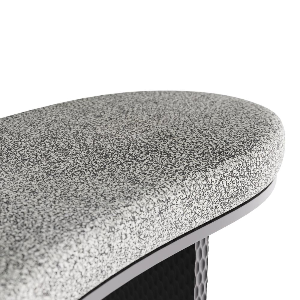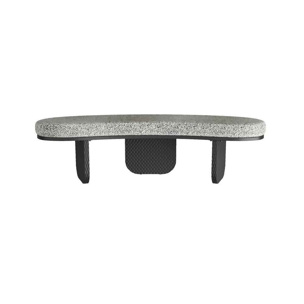 The playful lines of the settee are anchored with a sturdy hand-carved frame of ebony-finished mango wood. Recalling the quirky kidney shapes of the mid-century, this entryway essential is topped with an upholstered cushion in pitch texture fabric.