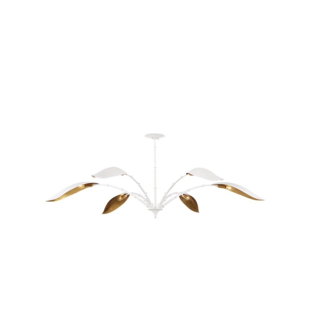 As if it has sprouted three pairs of lily petals that arc delicately away from each other, the Yuriko Chandelier is a crisp white creation until the interiors of those petals are glimpsed, as they are finished in a contemporary gold leaf that contrasts the gesso white beautifully. The brilliance of this design doesn't stop there: it continues in the pare-down quality of the stems from which the shades extend, which grow thinner as they move toward the petals; the circular details on these, which create an elemental knottiness like that of bamboo; and the elegant shape of the small cup from which they branch out. Adjustable from 33.5" to 101" with use of included chain/rod kit/cable. If your space calls for a longer drop, additional chain/rods/cable is available for purchase.