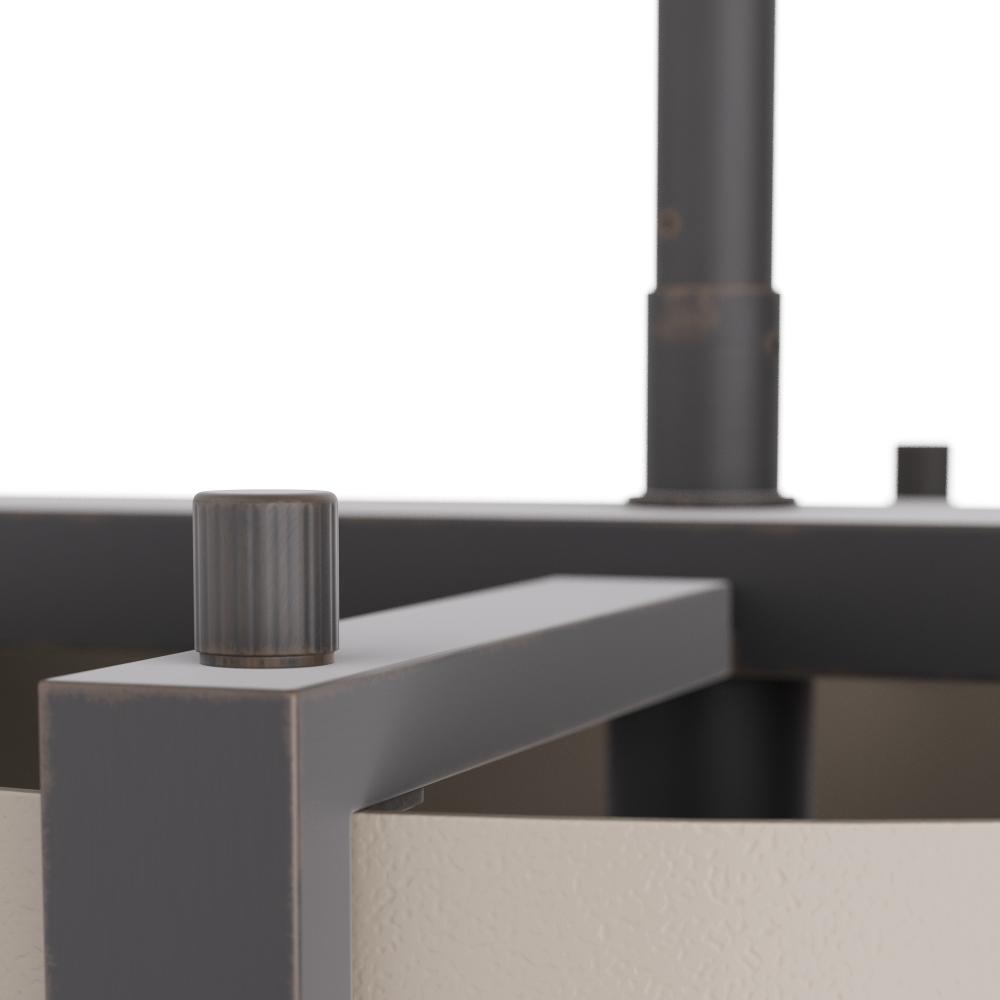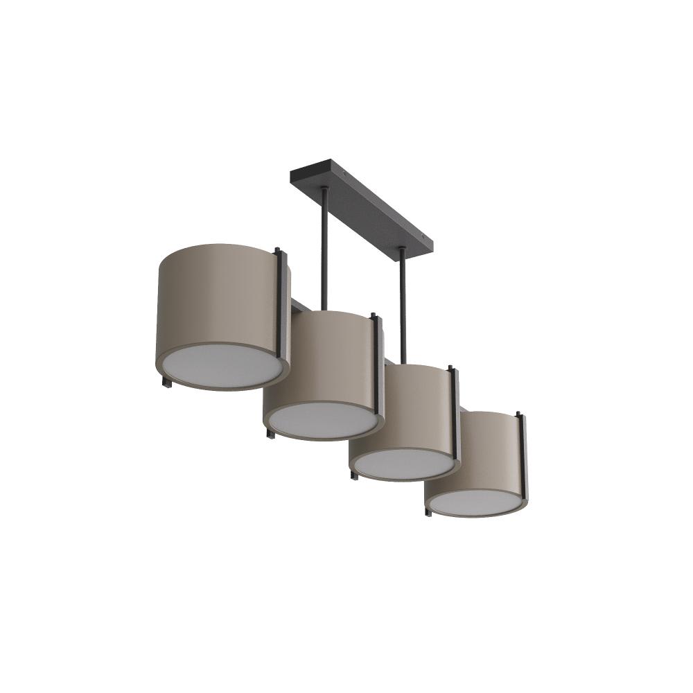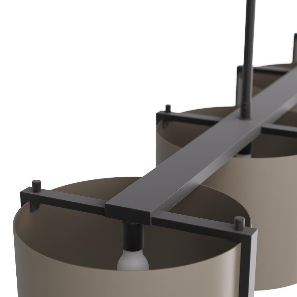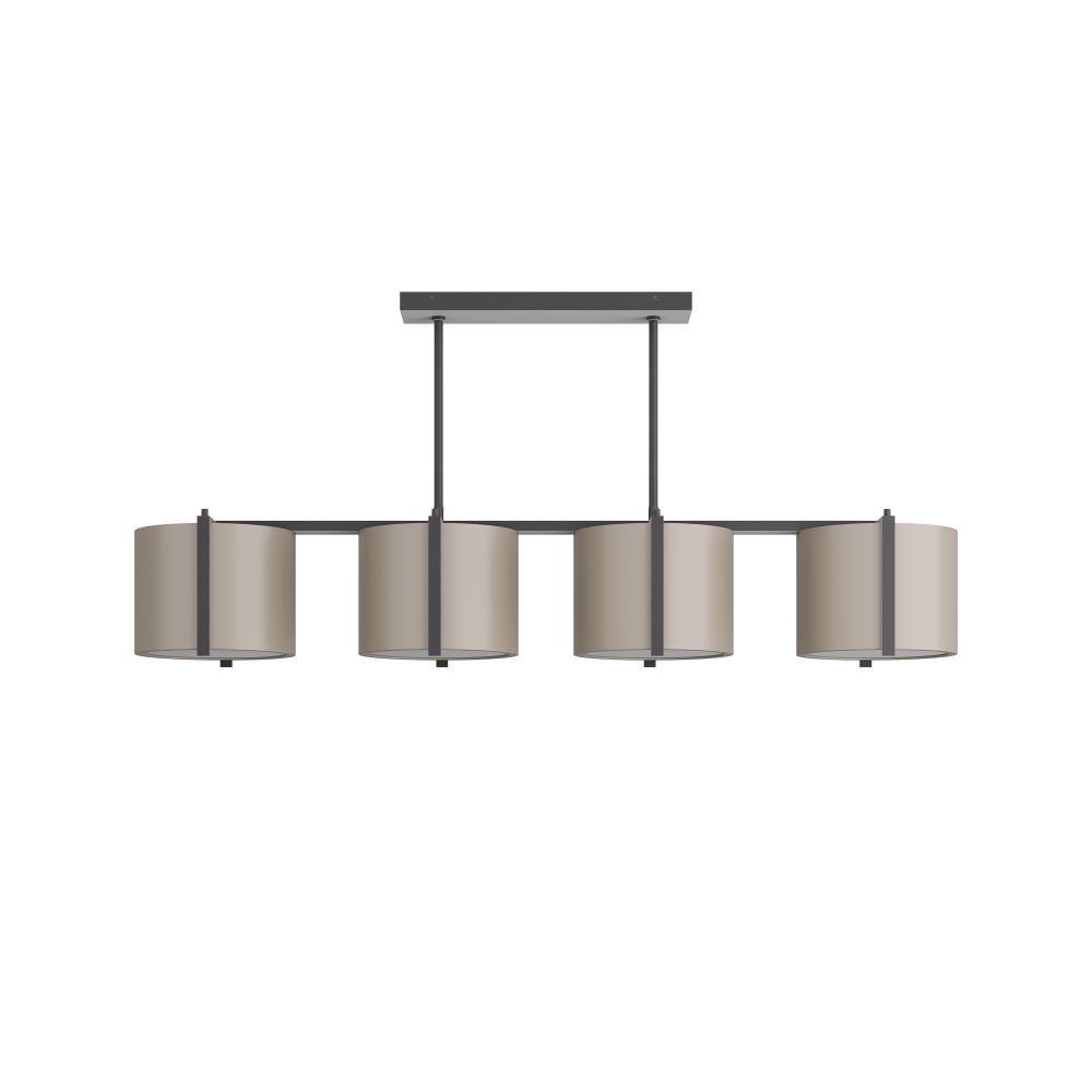 A streamlined linear chandelier adds a sophisticated anchor to any setting. Architectural in scale, a quartet of drum-shaped powder-coated steel shades in taupe are bisected with elegant metal accents of English bronze steel. Suspended from matching dual pipes, this two-toned fixture is a bold statement. Damp-rated, although limited covered outdoor conditions may affect finish.