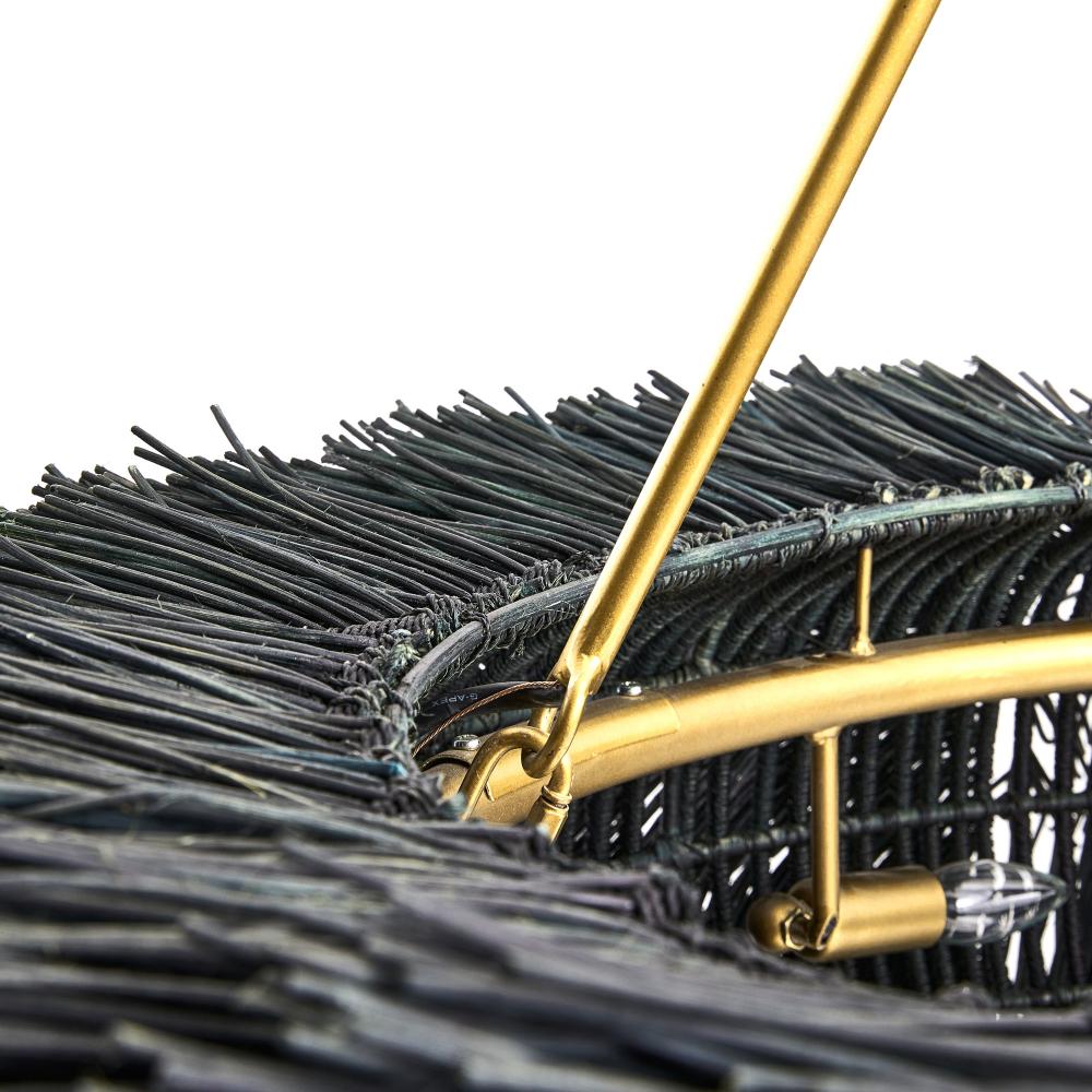 A play of shadow and light peeks through woven rattan in a classic ring silhouette. Stained in black and suspended from a trio of antique finished pipes and chain, Zaria was made to reflect intriguing shadows on walls and ceiling through the open weave of sustainable rattan. Finish will vary.