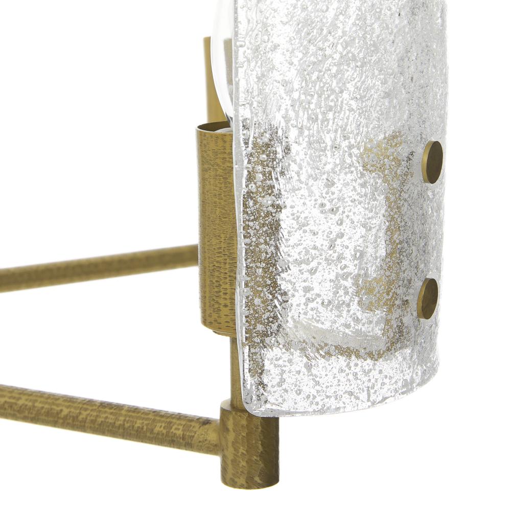 Six half-cylinder shades, crafted with clear seedy slump glass, are punctuated with decorative screws of antique brass. Suspended from an antique brass body with an intriguing mix of smooth and chattered texture, this luxe fixture lends a flattering, diffused effect to any room. Damp-rated, although limited covered outdoor conditions may affect finish. Finish will vary.