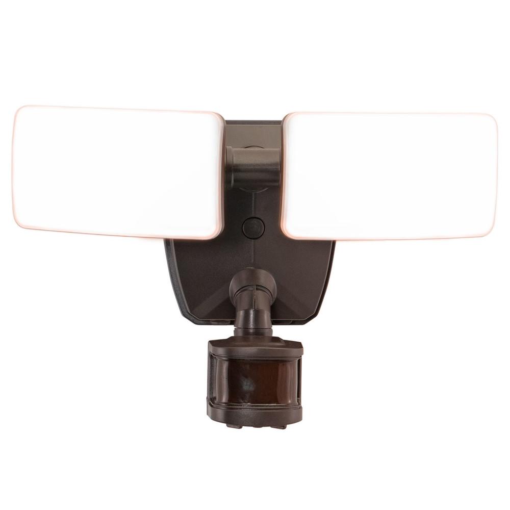 The bronze 2-light Zeta LED motion sensor security flood light provides adjustable low level brightness and color temperature while also delivering brilliant 5000K high level illumination when motion is detected. The modern light heads are fully adjustable and deliver 2,400 lumens to keep your home's exterior brighter at dusk, dimmer at night, and instantly bright when motion is detected. This dualux security light expands the functionality, safety, and security of your home's outdoor spaces with bright, reliable light when and where it is needed.