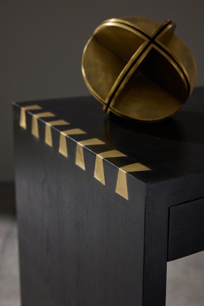 The craftsmanship of classic dovetail joinery inspired this modern desk of ebony finished solid oak. Constructed with bold inlaid antique brass joints at the side edges, it was designed to float seamlessly in any room. A single drawer is adorned with an antique brass accent.