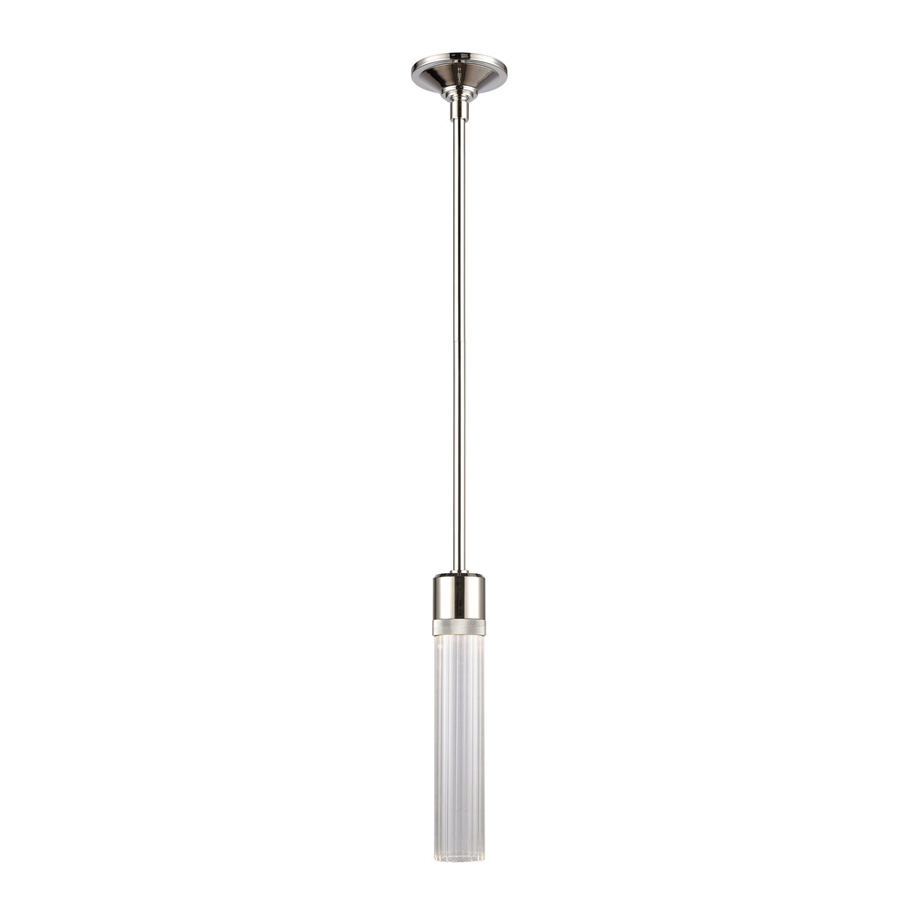 3" High End Vertical Cylindrical Pendant Light, 12" Fluted Glass Shade and Our Luxurious Polished Nickel Finish with Detailed Diamond Knurled Metal Band. Integrated Replaceable LED with 3CCT 3000K, 3500K and 4000K.